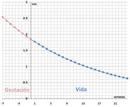 No seguinte gráfico, podemos ver a velocidade de crescimento do crânio do bebé durante os dois últimos meses de gestação e até aos seis primeiros meses de vida. Os dados derivam de vários estudos estatísticos sobre a população europeia.
