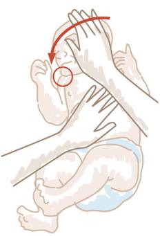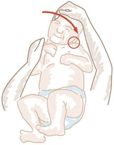 No primeiro exercício, com uma mão sobre o peito, faça girar a cabeça do bebé até que o queixo toque no ombro.